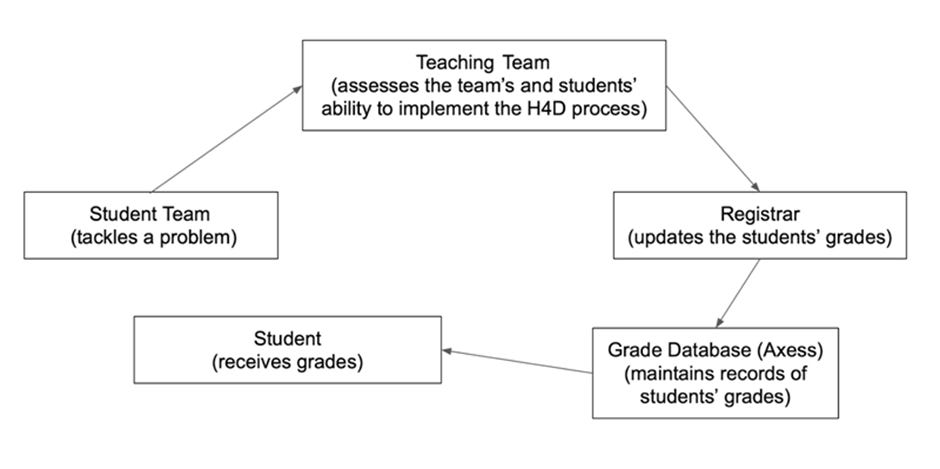 Most are likely familiar with the concept of a workflow, even if you haven’t developed one. For example, below is a workflow diagram for an H4D team’s grades (note that it is information that is being moved). The H4D workflow diagram indicates how information moves between entities and the role each plays in the H4D wider college/university ecosystem.