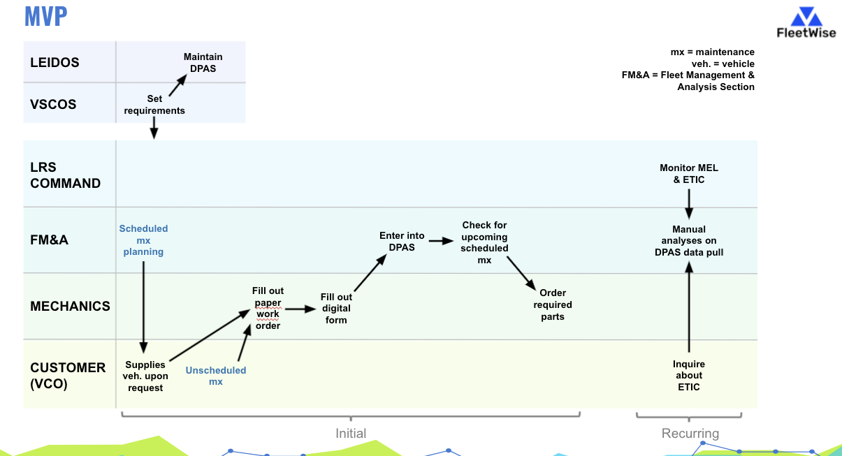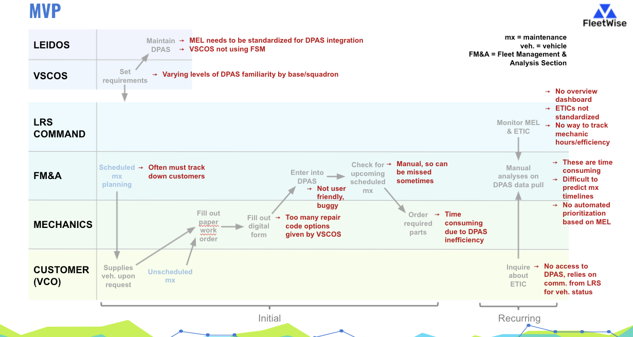 To accomplish this learning, Fleetwise created a workflow diagram from their interview notes and online research and used it as an MVP. The workflow MVP showed how information was processed from the mechanic all the way up to the highest levels of the Logistics Readiness Squadron. The goal was to understand the responsibilities of each position, the steps involved in facilitating fleet management, and identify the most critical steps in the process, along with bottlenecks. This is what they came up with:
