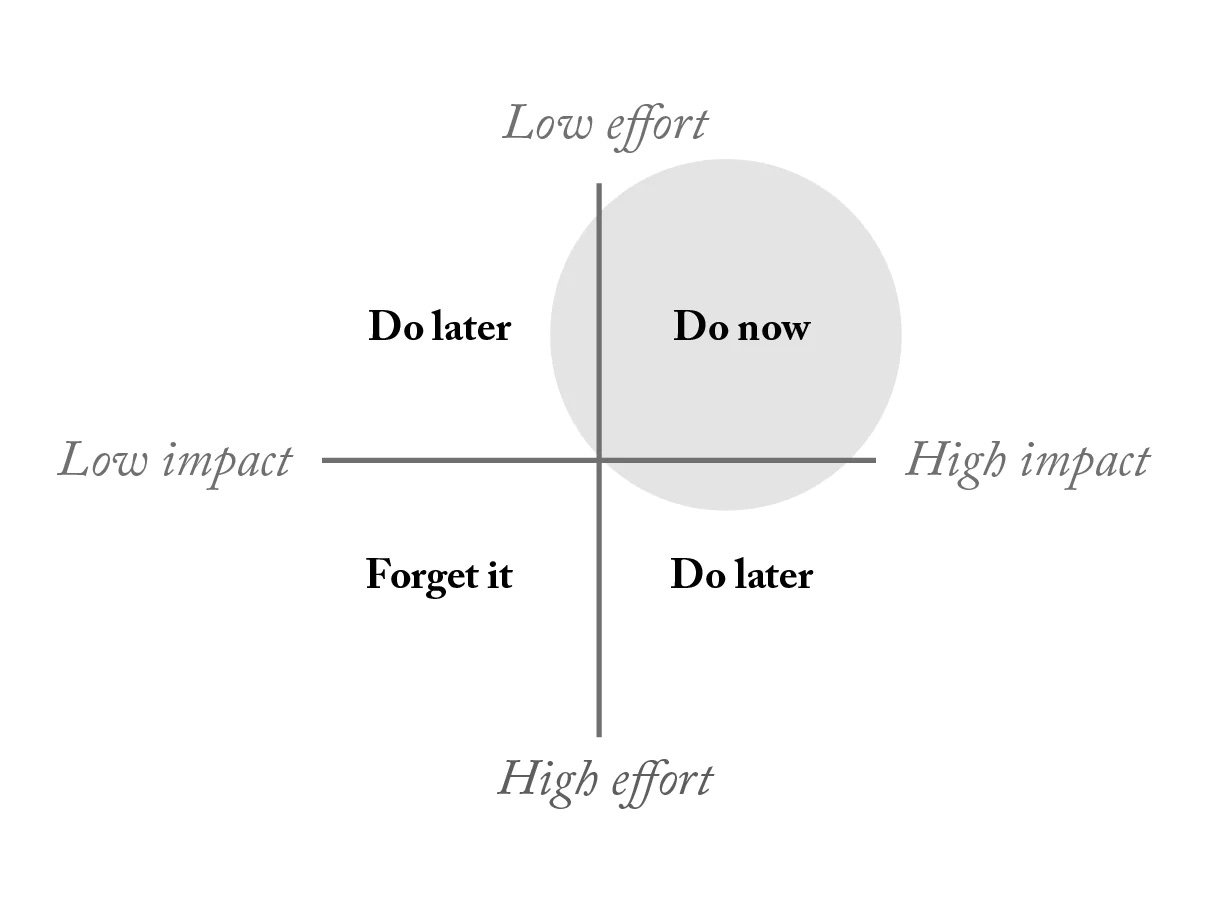 Use a whiteboard to draw a Priority Map with 'Impact' and 'Effort' on the axes (see below). Ensure that it’s large enough to fit the most important of your “painpoint” post-its.